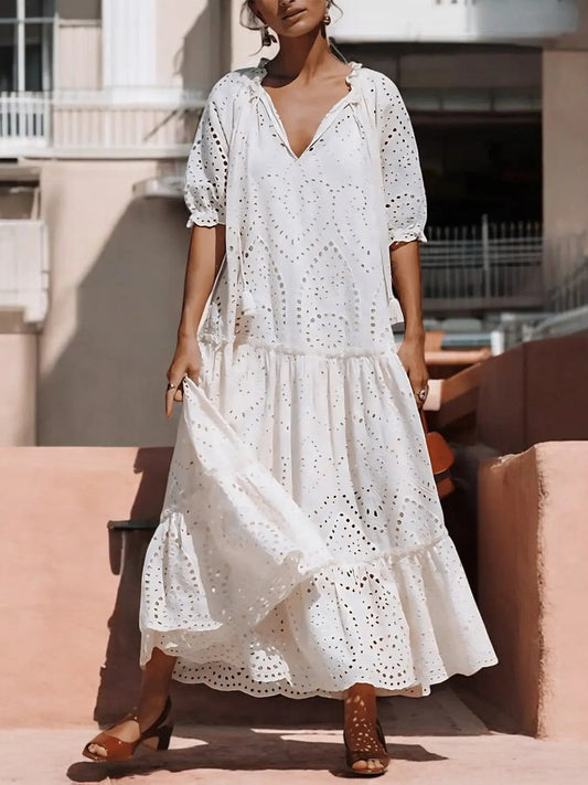 Addison - Chic hvit eyeletkjole med puffede ermer