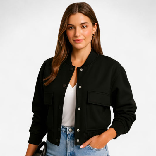 Frida – Kort bomberjakke med klafflommer og trykknapplukking