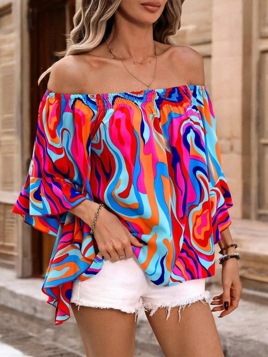 Hannah - Av skuldrene bluse med dristig abstrakt trykk og flytende ermer