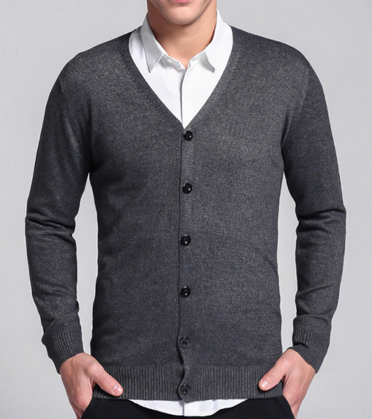 Hannes - Stilfull Langermet Strikkjakke med V Hals Slank Passform og Knapper
