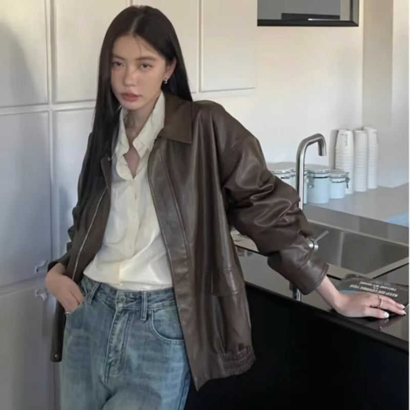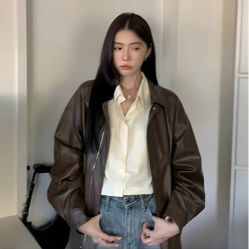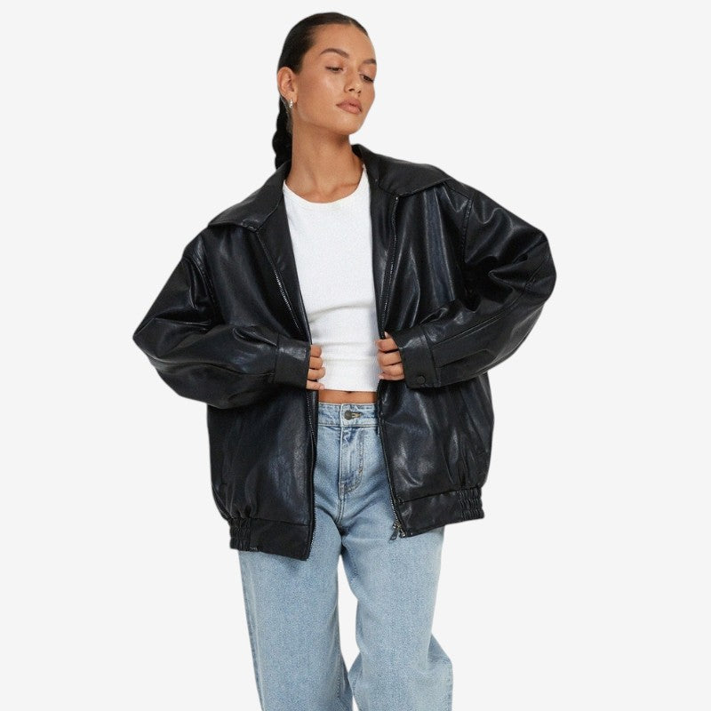 Aria-jakken er laget av skinn og har en klassisk jakkeslagskrage med lange ermer. Den har ribbekant nederst og en glatt overflate som gir et elegant og moderne uttrykk. Designet har en rett silhuett med jevne sømmer og et rent, ferdig utseende – perfekt for både hverdagsbruk og stilige anledninger.