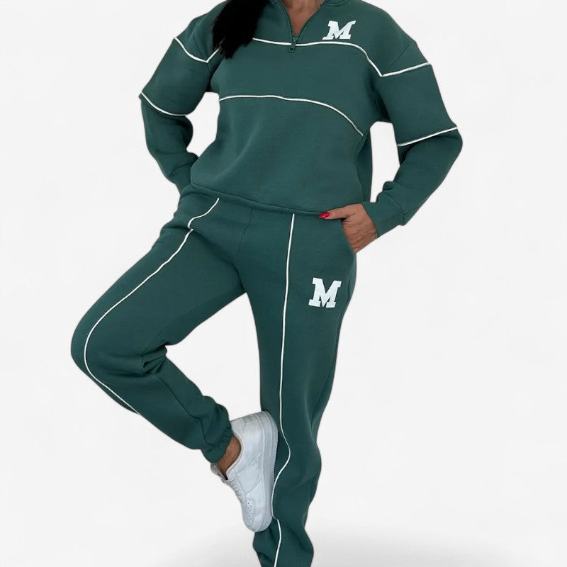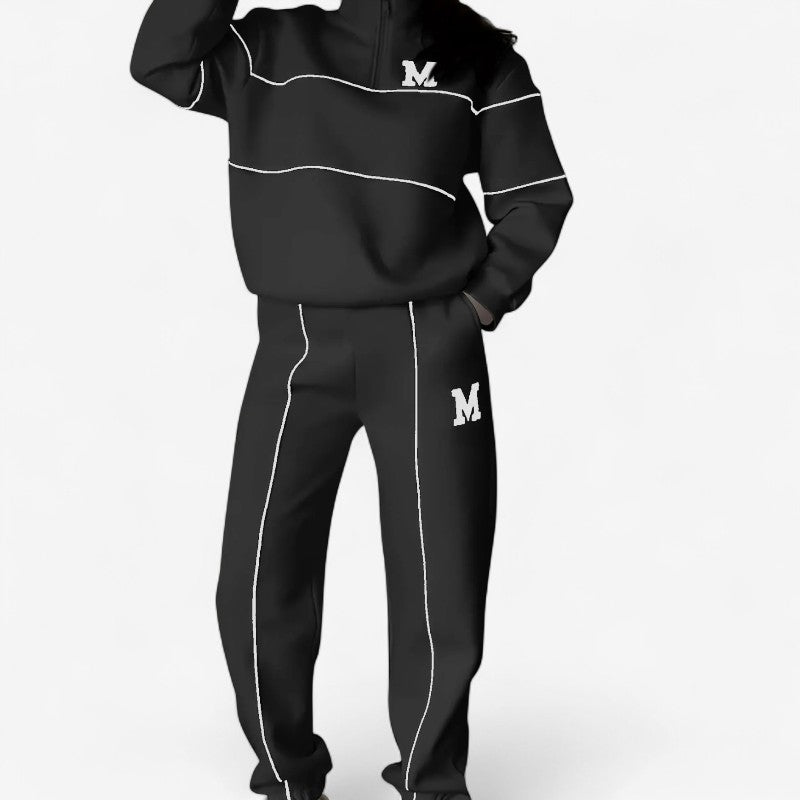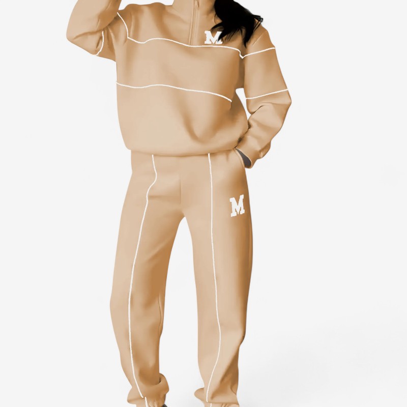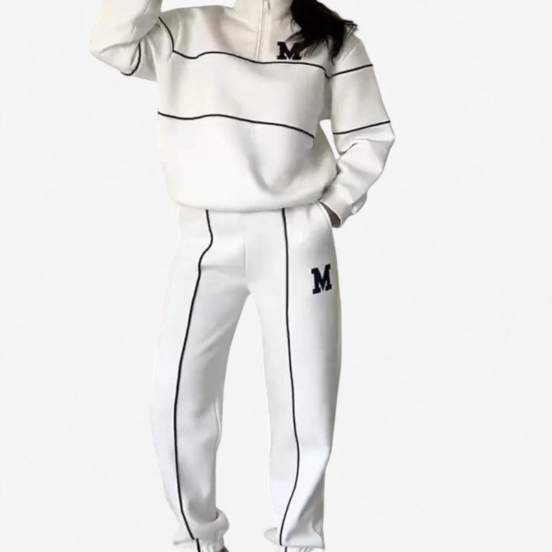 Astrid to-delt sett inkluderer en langermet skjorte med glidelås og vide bukser med lommer. Settet har et koordinert design og kan brukes til uformell eller daglig bruk.