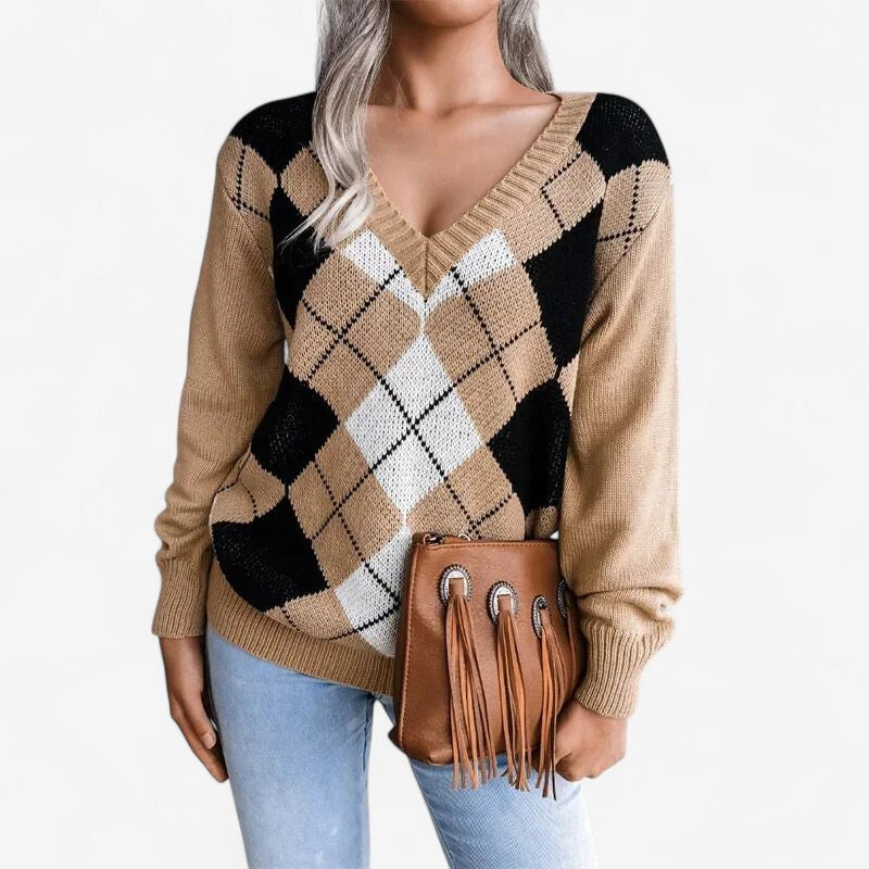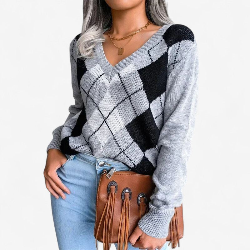 Elena-genseren er laget av polyesterstoff og har en V-utringning med lange ermer. Den lette strikkede overflaten og den rette fasongen gir et enkelt og elegant uttrykk. Genseren har rene avslutninger rundt hals, ermer og kant for en glatt og behagelig finish.