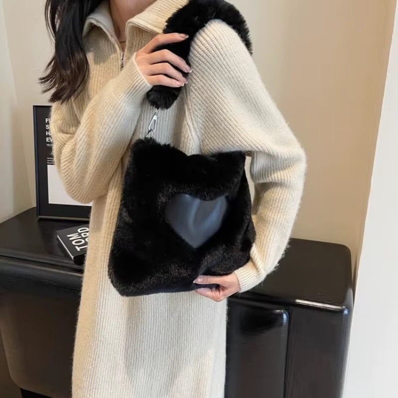 Ella-håndvesken er laget av mykt plysjmateriale og har en skulderrem med justerbar spenne for behagelig bæring. Den har et lite topphåndtak og et hjerteformet dekorfelt på fronten som gir et søtt og elegant preg. Vesken har en kompakt form med myke kanter og glatt overflate – perfekt som et moteriktig tilbehør til både hverdagsbruk og spesielle anledninger.