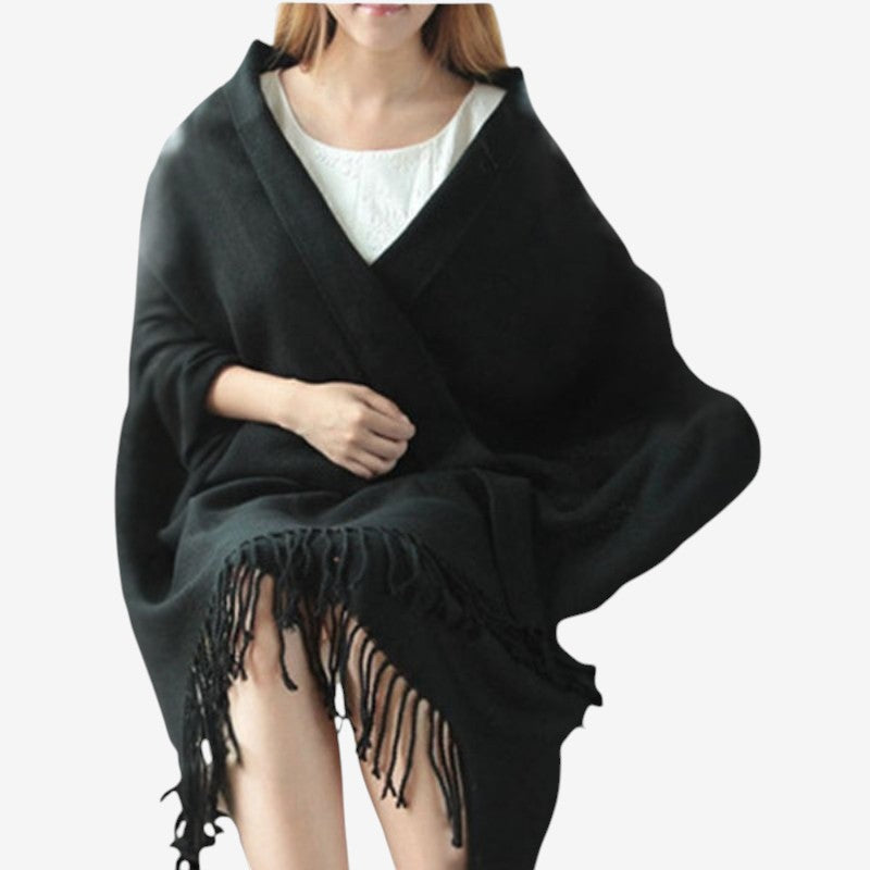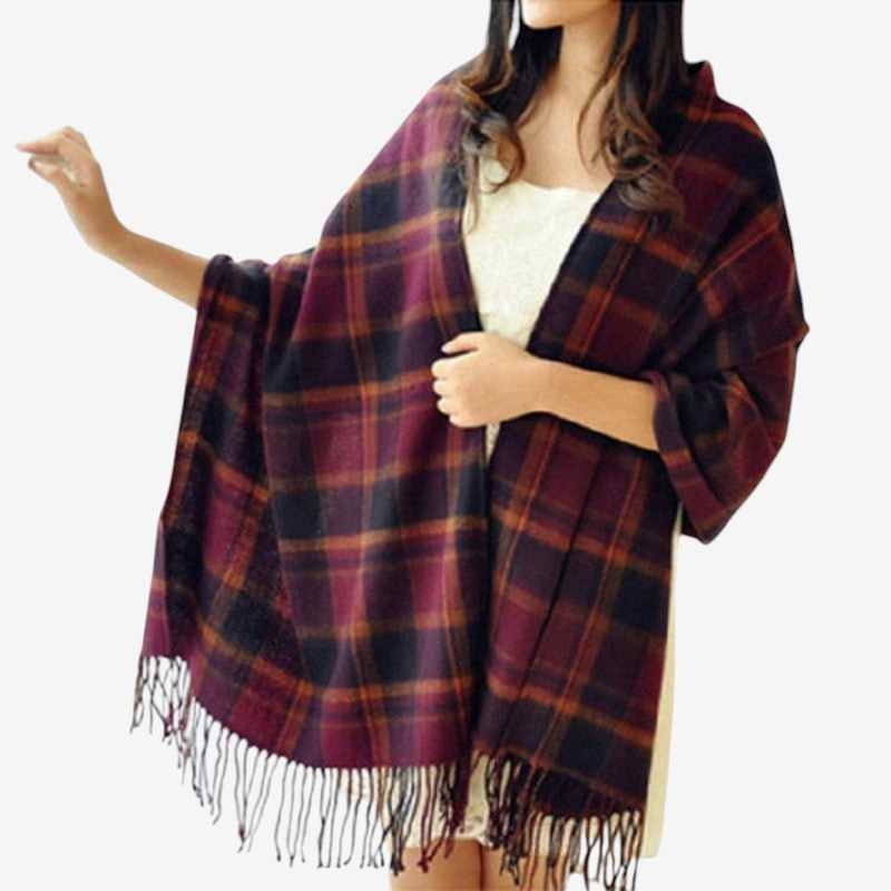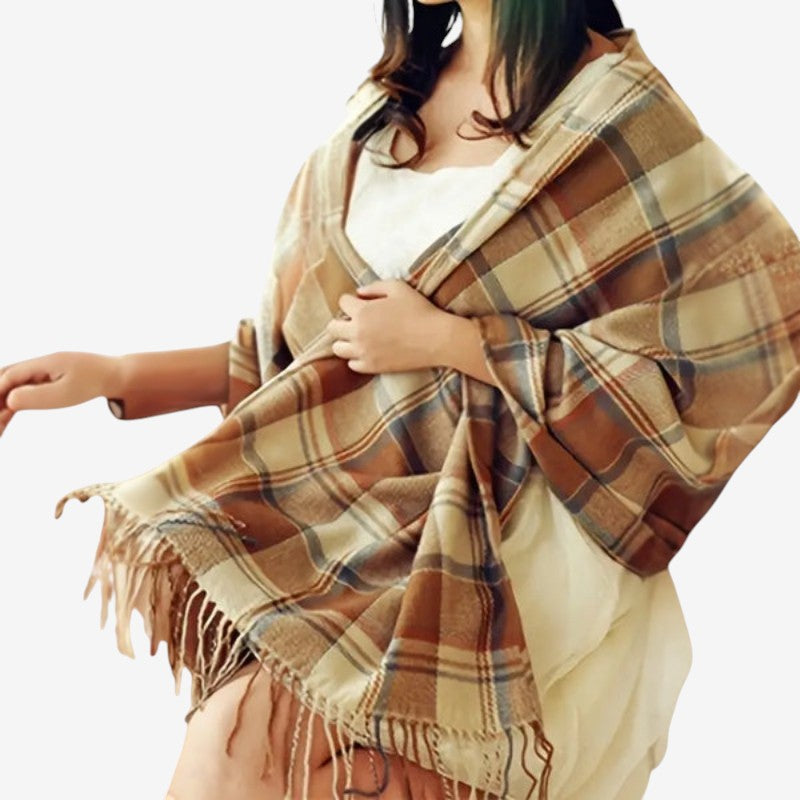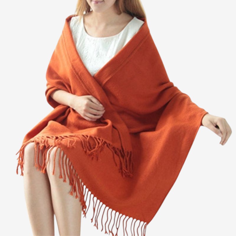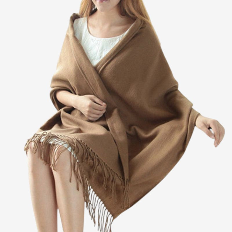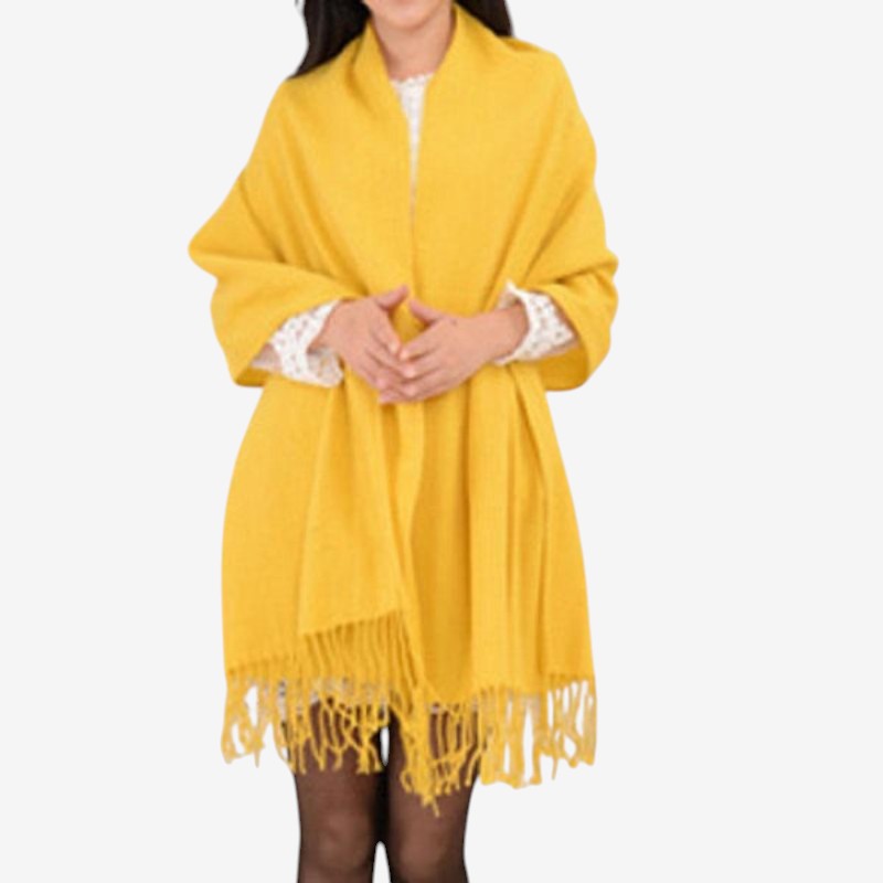 Emilia-storskjefet har dekorative dusker og en tykk utforming for komfortabel lag-på-lag-bruk. Den romslige størrelsen gjør det enkelt å drapere eller vikle rundt, og tilfører et livfullt preg til ethvert antrekk.