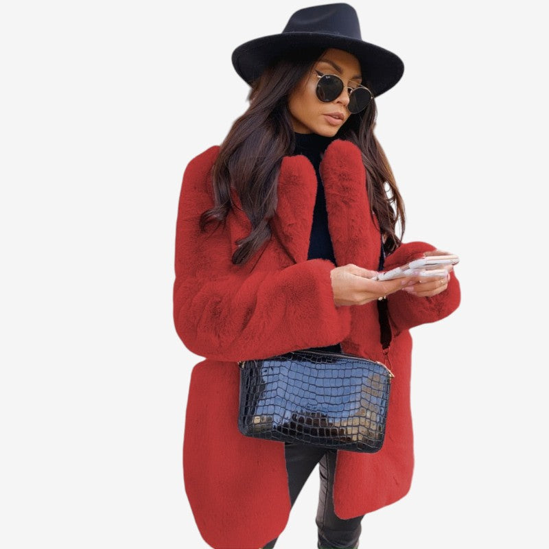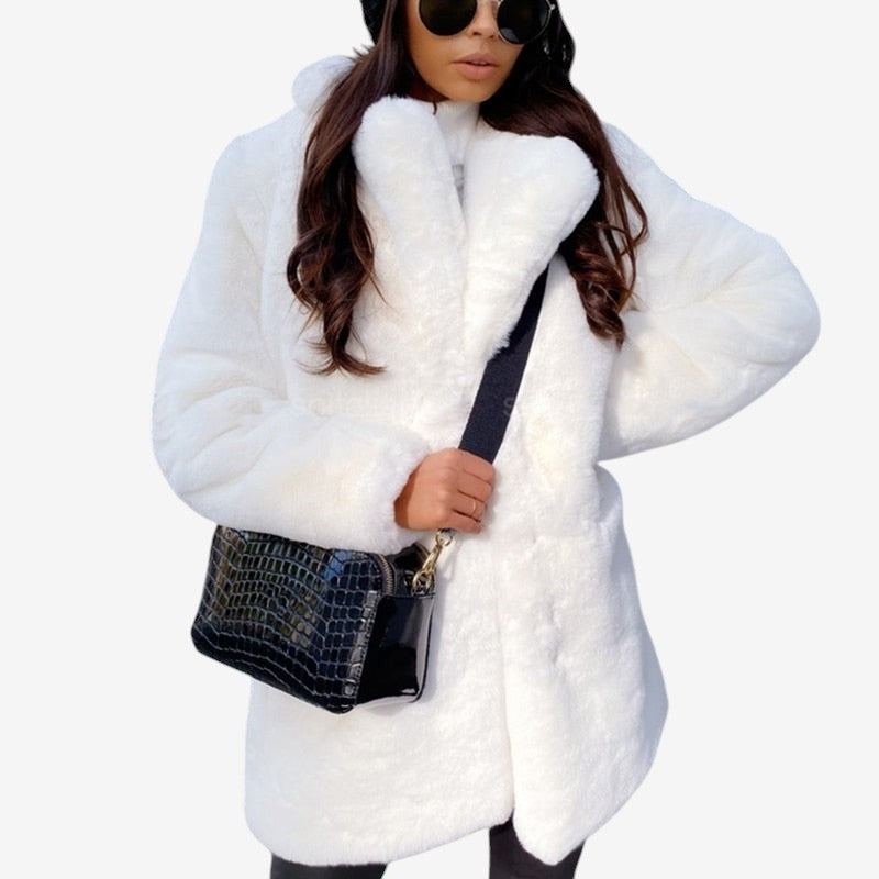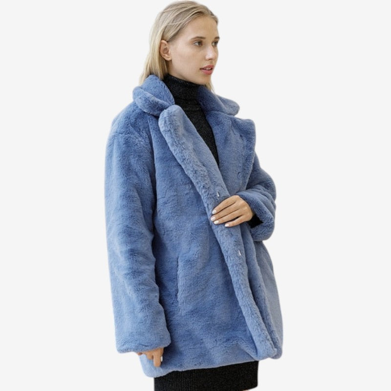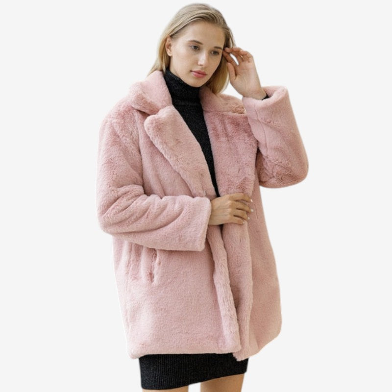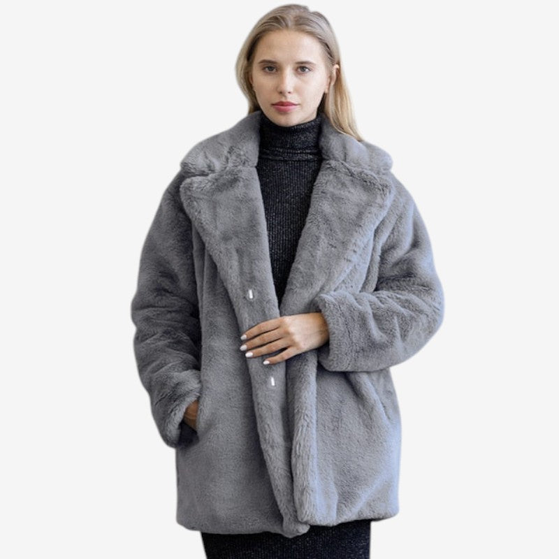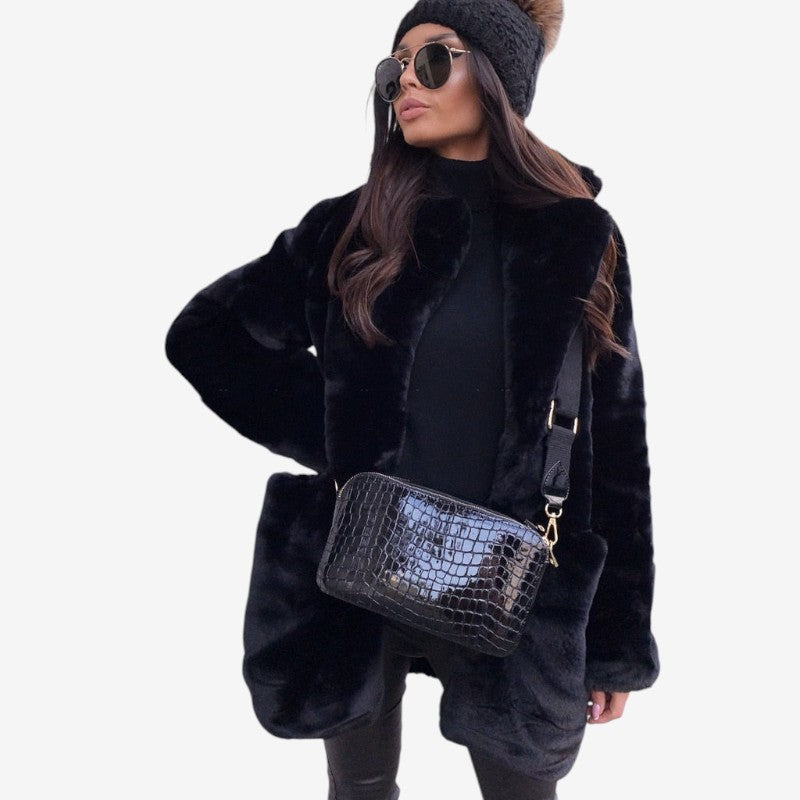Emma-kåpen har lange ermer, et strukturert jakkeslag og sidelommer på begge sider. Den rette silhuetten og den glatte overflaten i imitert pels gir et rent og elegant uttrykk. Med pent avsluttede kanter på ermer og fald kombinerer kåpen varme og stil til både hverdagsbruk og mer formelle anledninger.