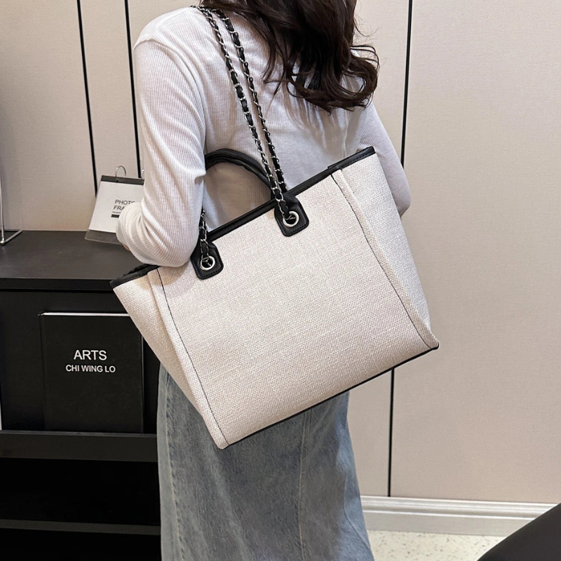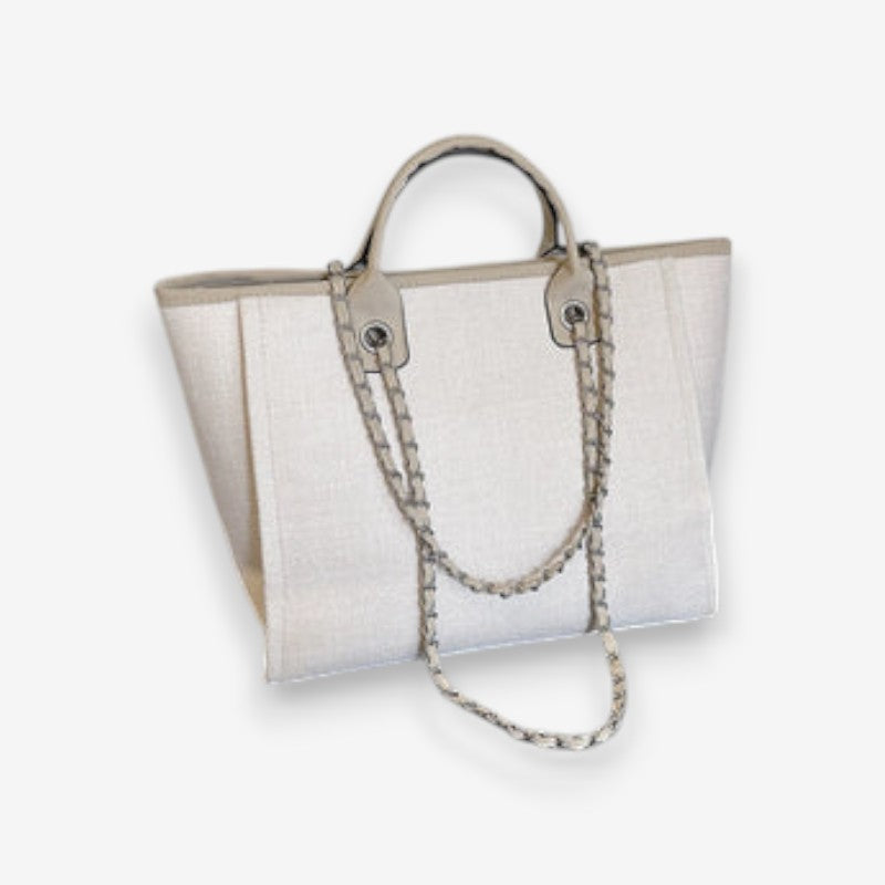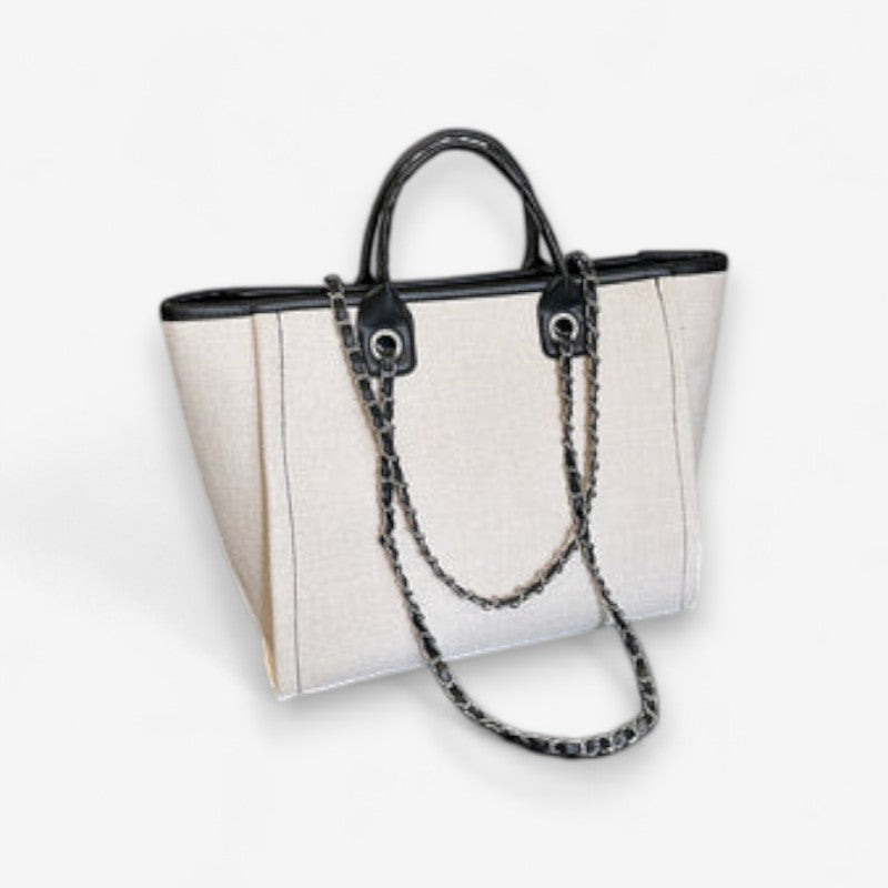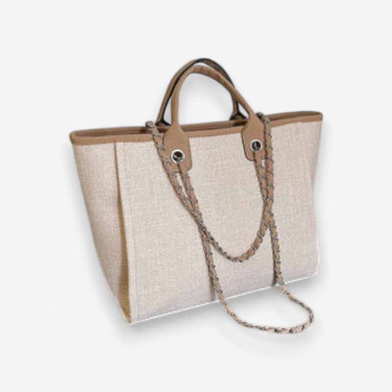 Fenna er en stor toteveske med firkantet form og kjedestropp. Vesken har glatte paneler, glidelåslukking og et romslig innvendig rom. Den strukturerte formen holder rene kanter og definerte linjer.