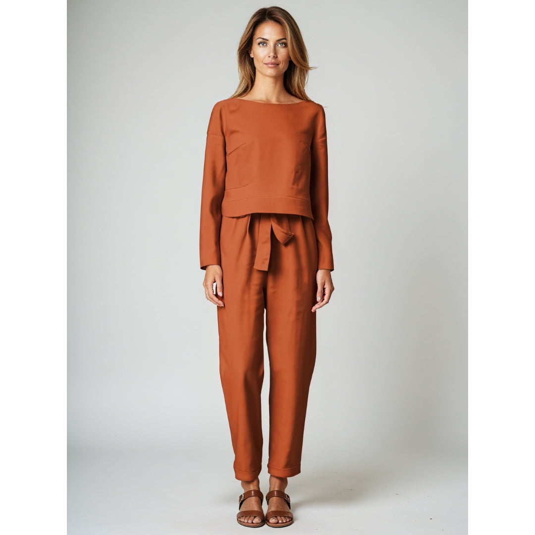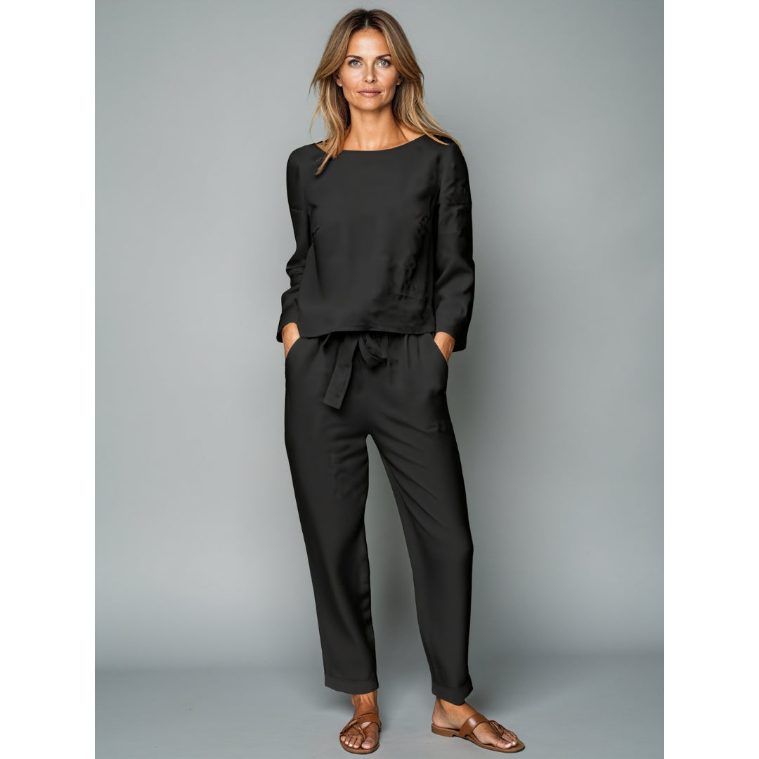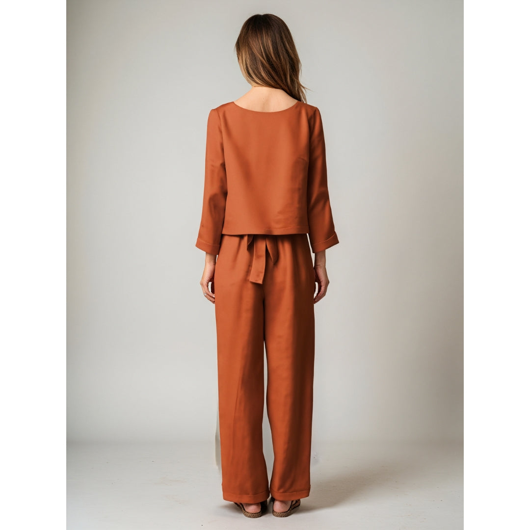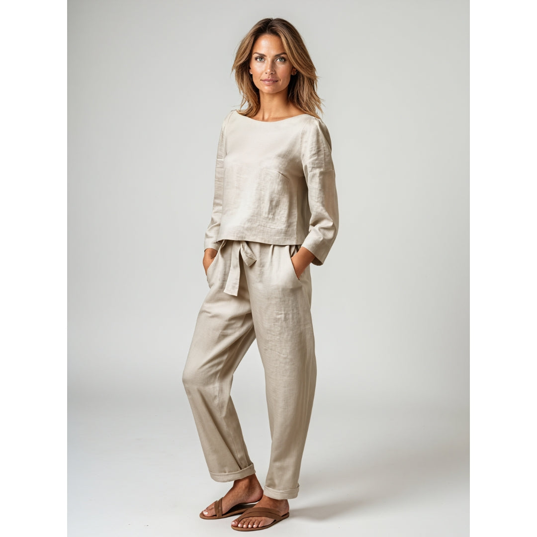 Dette todelte settet kombinerer avslappet letthet med et elegant preg, noe som gjør det til et must-have for enhver garderobe. Buksen utfyller den avslappede toppen og skaper en balansert look som passer perfekt til både uformelle utflukter og mer avslappede arrangementer. Gretas design er laget for å kunne integreres sømløst med den eksisterende garderoben din, og gir deg uendelige stylingmuligheter. Enten du er ute og tar en kaffe eller tilbringer tid med familien, har dette settet det du trenger.