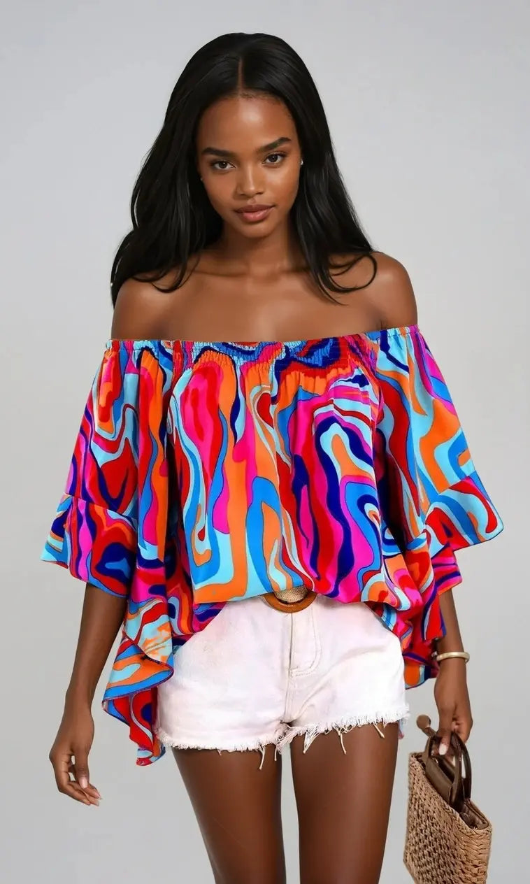 Denne blusen har et fargerikt abstrakt virvelmønster, noe som gjør den til en fremtredende del i enhver garderobe. De brede, flytende ermene gir et dramatisk preg og forsterker den bohemske stemningen, mens den off-the-skulder-designen understreker halsen og skuldrene, perfekt for varmt vær. Den avslappede passformen sikrer komfort og enkel bevegelse.