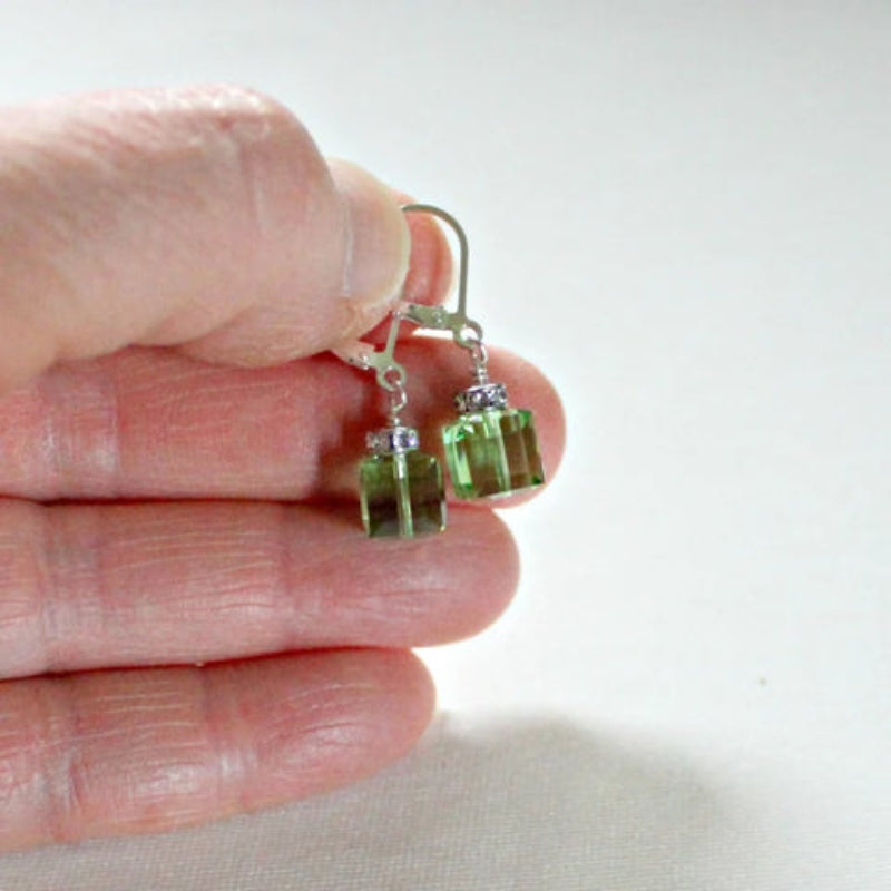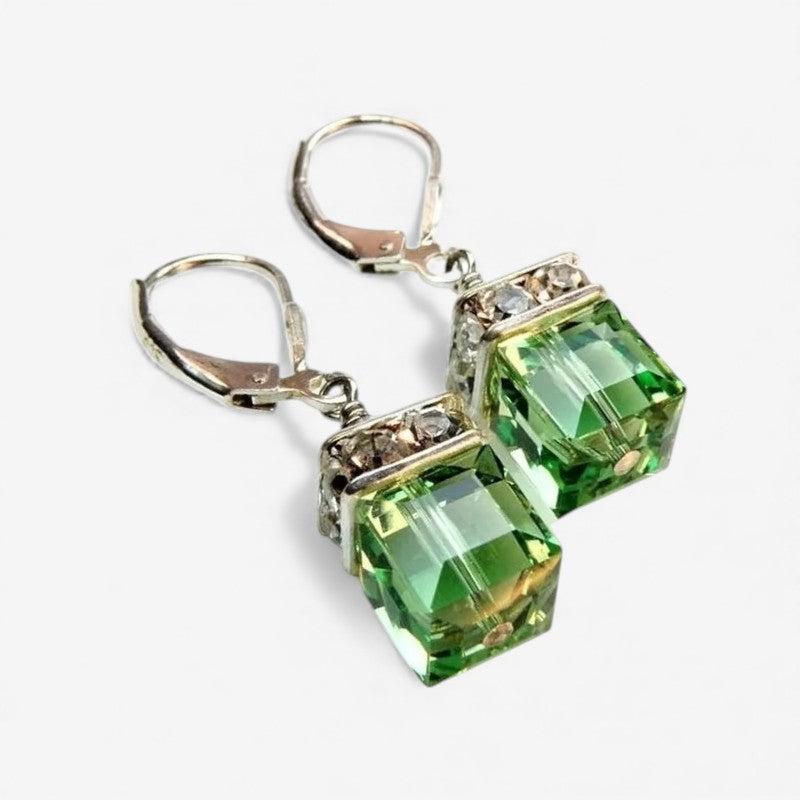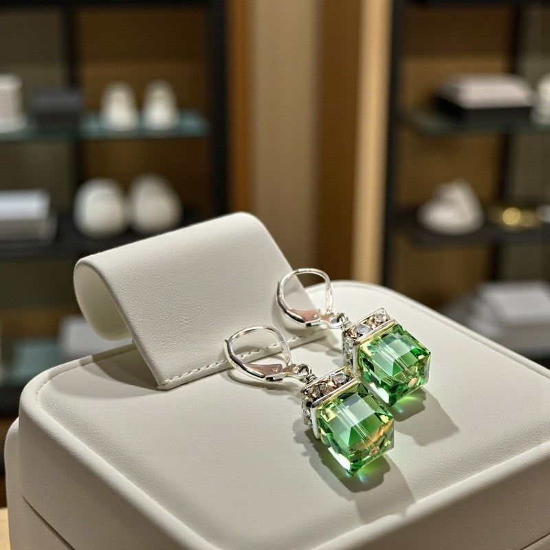 Disse firkantede øredobbene har et slankt, moderne design som tilfører en sofistikert touch til ethvert antrekk. Perfekte til hverdagsbruk eller spesielle anledninger, med subtile grønne krystallaccenter som fanger lyset for en diskret glans.