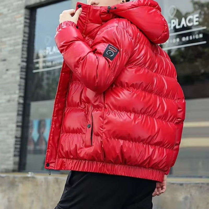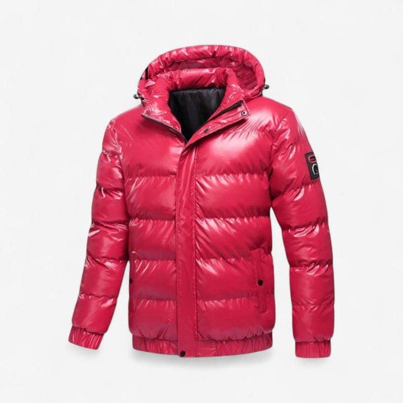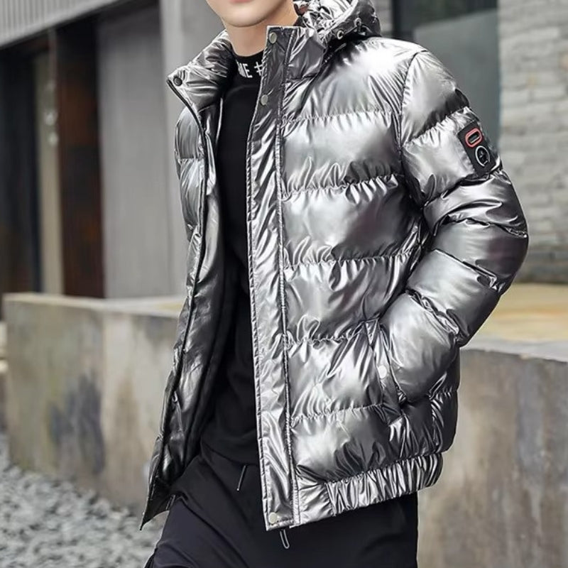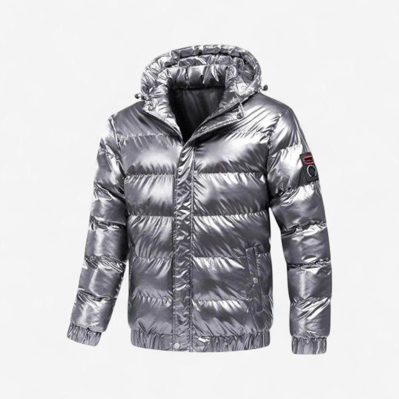 Jameson-jakken har en vattert konstruksjon med lange ermer og rett, balansert silhuett. Den har en hette med justerbare snorer og to sidelommer. Fronten har dobbel lukking med knapper og glidelås. Designet er symmetrisk med rene linjer og minimal detaljering.