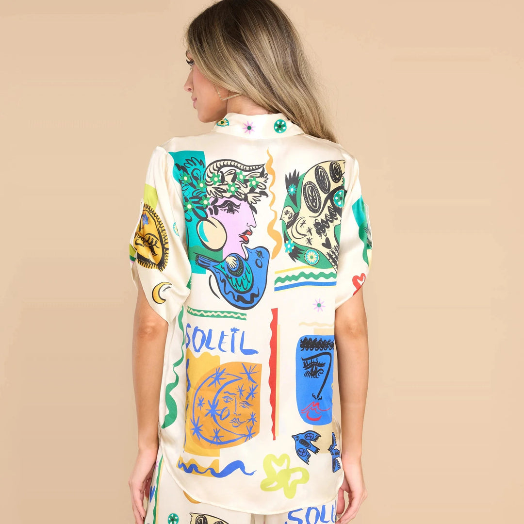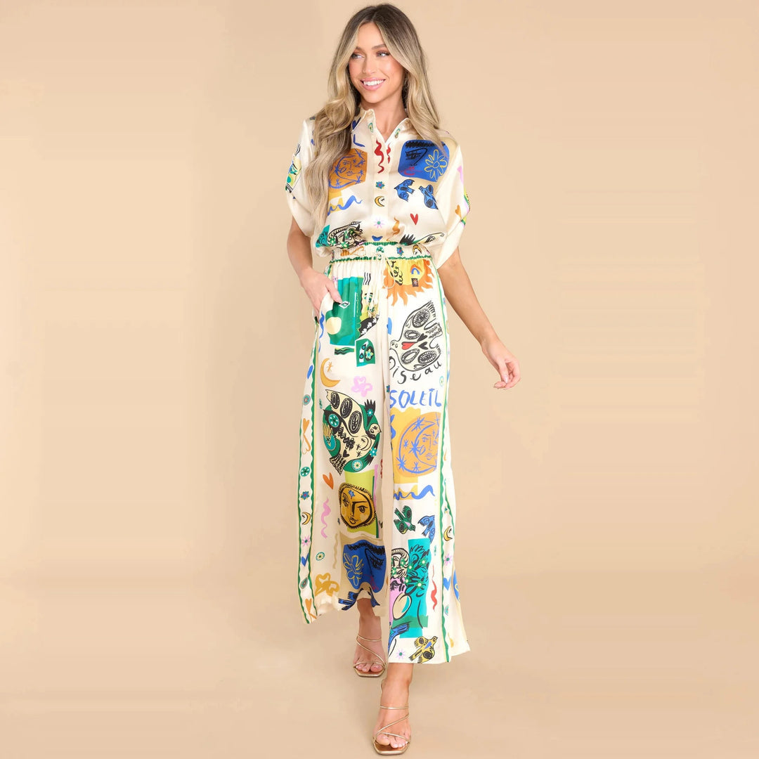 Dette skjorte- og bukse-settet er en fantastisk demonstrasjon av kreativitet, med en vakker rekke av kunstneriske blomstermønstre som tilfører farge og fantasi til garderoben din. Skjorten har en spiss krage og en knappestolpe foran, perfekt kombinert med vide, flytende bukser for et chic og komfortabelt antrekk. Laget av lett stoff, sikrer dette settet at du forblir elegant uten å ofre komforten.