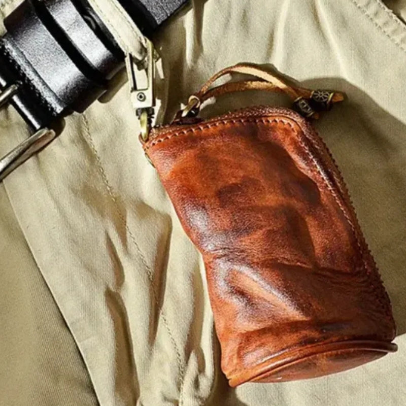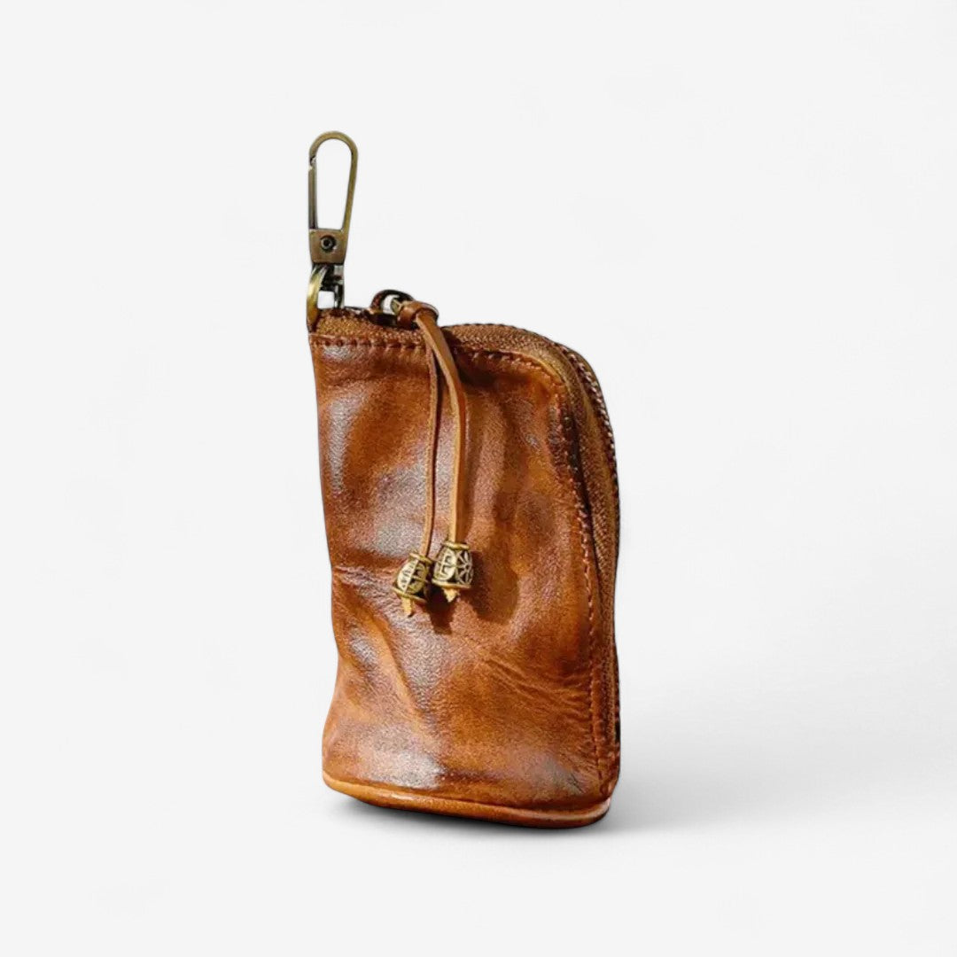 Knut-nøkkelring-lommeboken har et strukturert design med glidelås-lukking. Den har interne rom for kort og nøkler, med en flat base.
