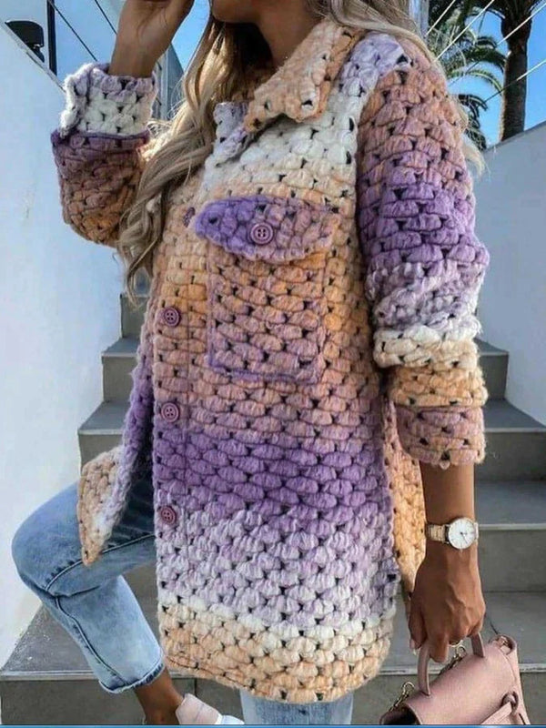 Denne myke og pustende kofta gir både komfort og stil. Det elastiske materialet sørger for en behagelig passform som beveger seg med deg, noe som gjør den perfekt for lang bruk. Den livlige fargegradienten og den tykke strikken gir garderoben din et moderne preg og fremhever enhver casual look.