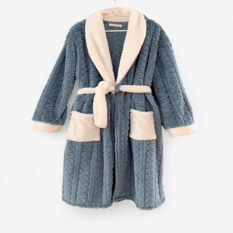 Latoya er en langermet badekåpe med krage, belte og sidelommer. Den har lange ermer for dekning og et belte for justerbar passform. Den er egnet for hjemmebruk.