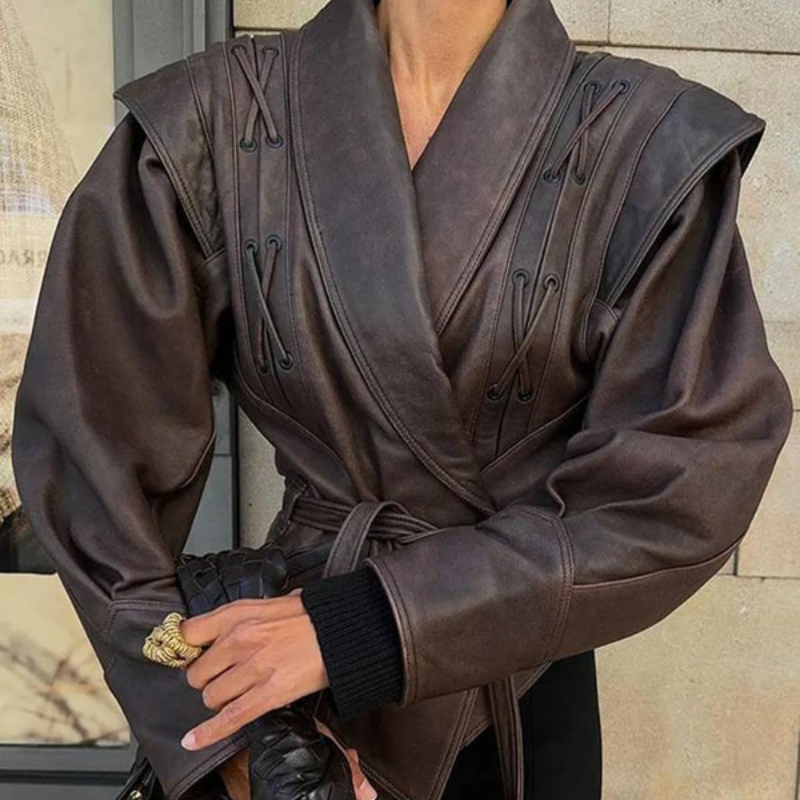 Lena jakke har en strukturert krage, knappelukking og belte for en definert silhuett. Med sine lange ermer og raffinerte design er den et allsidig plagg som passer til både uformelle og elegante antrekk.