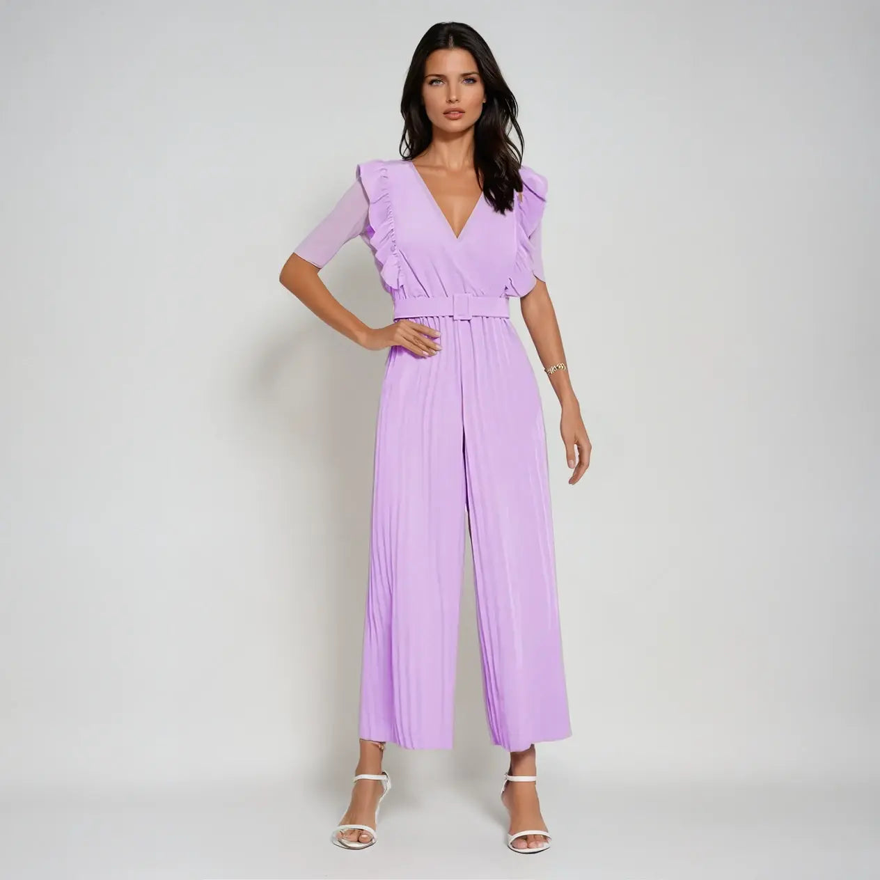 Denne plisserte jumpsuiten har et teksturert design som tilfører eleganse og raffinement, perfekt for enhver begivenhet. Den myke lavendelfargen gir en forfriskende touch, ideell for vår- og sommerutflukter. Den flatterende V-halsen og volangermene gir en leken, feminin detalj som gjør at denne jumpsuiten skiller seg ut. Med belte i midjen og snitt med brede ben, fester den silhuetten og tilbyr ultimat komfort og enkel bevegelse.