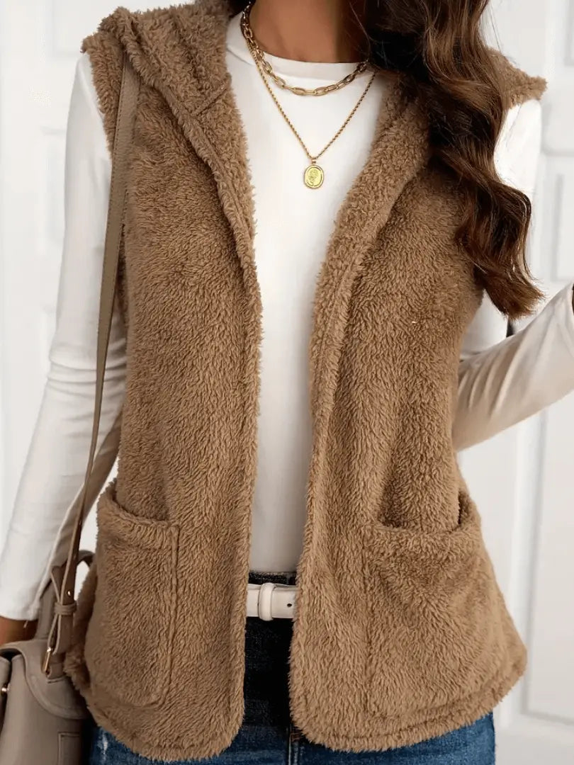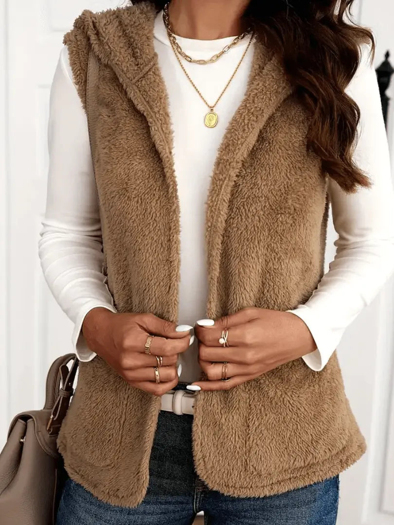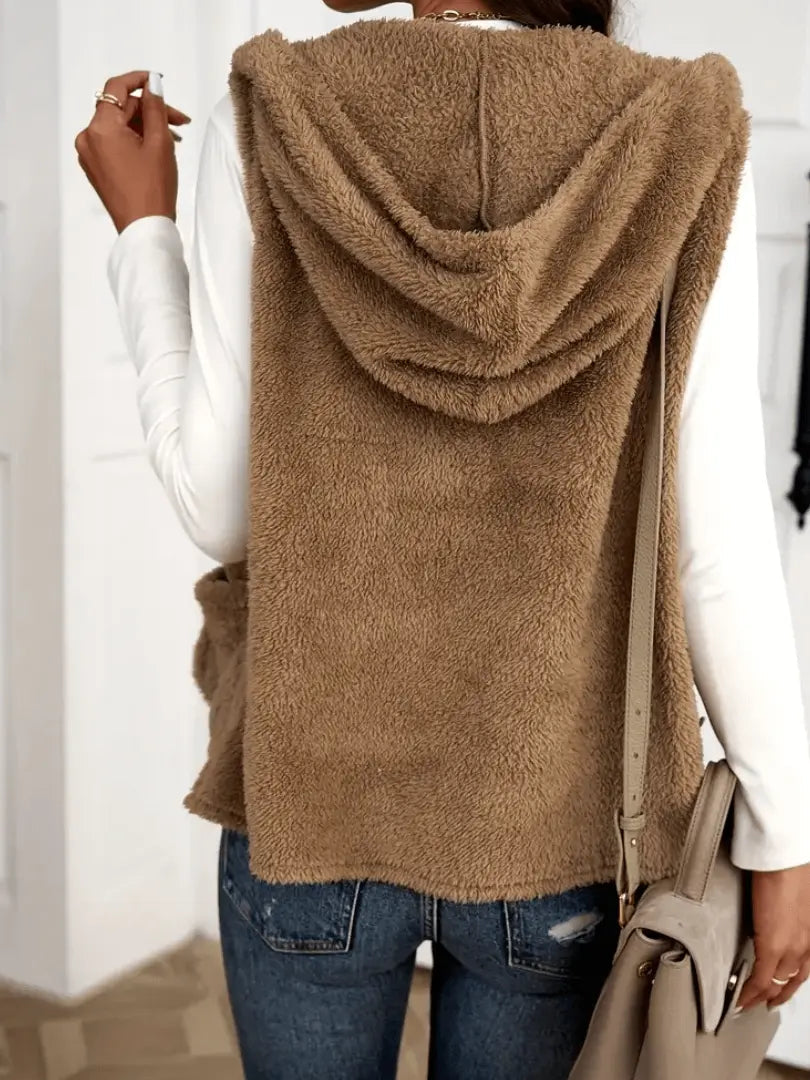 Linnea - Koselig ermeløs hettevest med fluffy tekstur