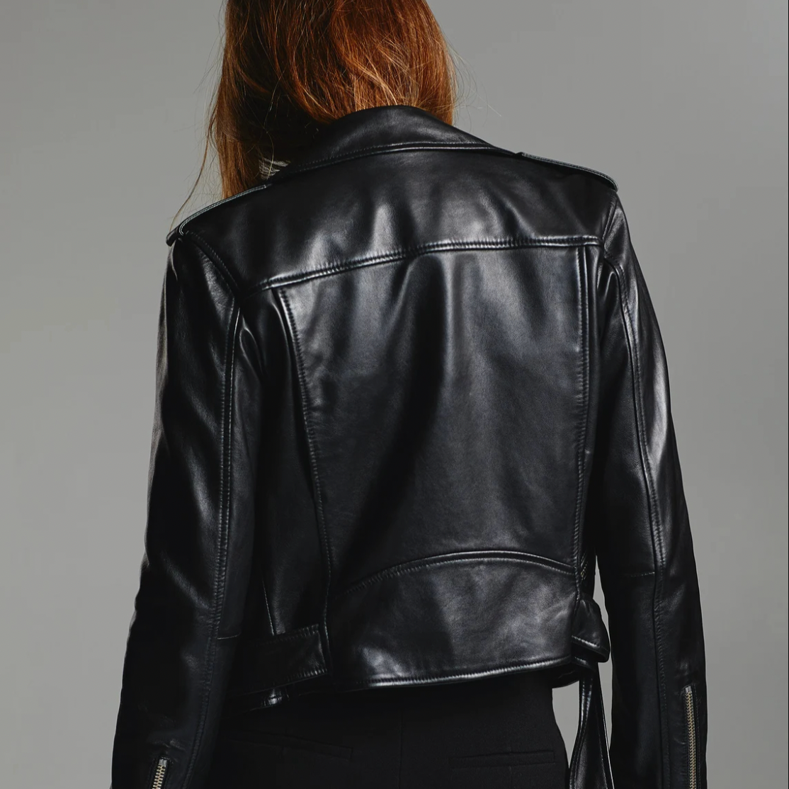 Lucy-jakken utstråler en uanstrengt, edgy stil, inspirert av klassisk motorsykkelmote. Den tettsittende silhuetten flatterer figuren og fremhever midjen for et elegant og skarpt utseende. Den asymmetriske glidelåsen foran og beltet i midjen gir den et dristig, moderne preg, samtidig som den opprettholder en tidløs appell.