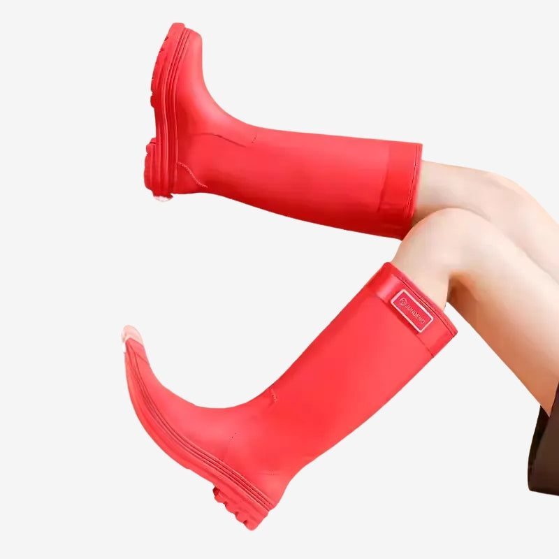 Maaike-gummistøvlene til knærne har tykk sklisikker såle som gir stabilitet og komfort. Deres slitesterke design gjør dem perfekte for uformell utendørsbruk.