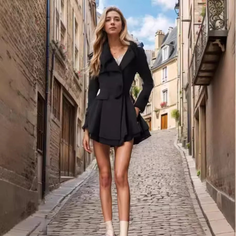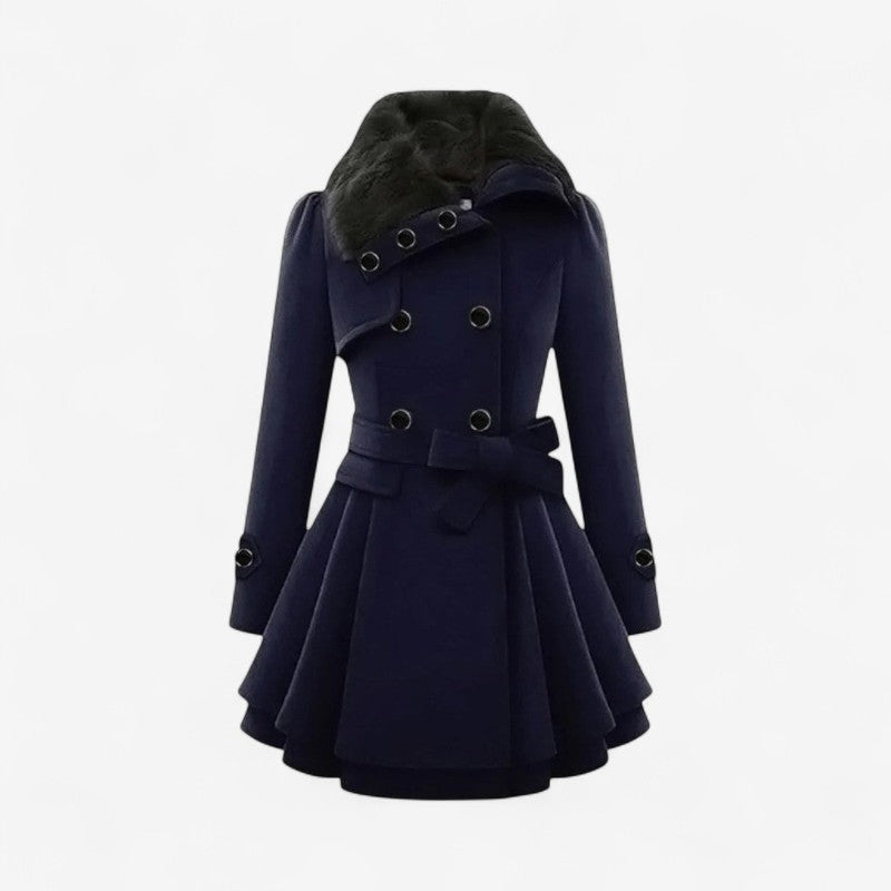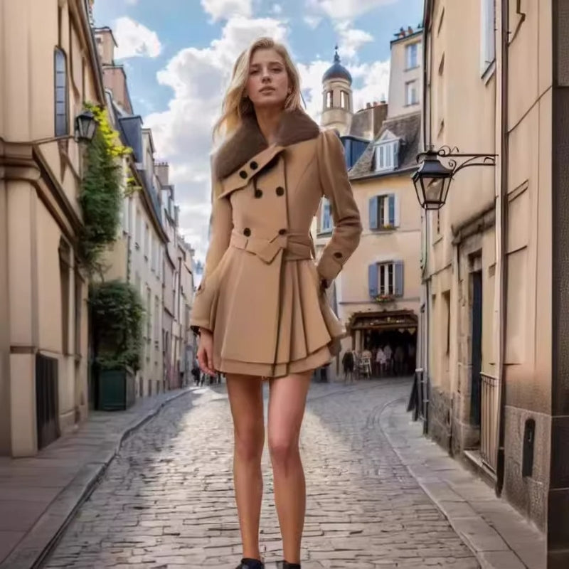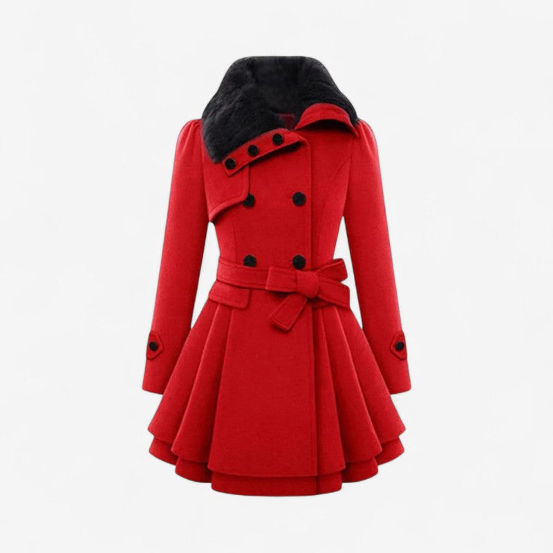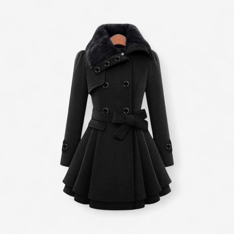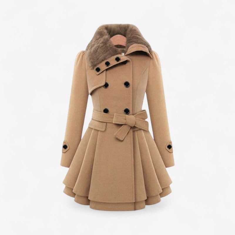 Madison-frakken har rett snitt med lange ermer og knappelukking foran. Et belte i midjen skaper en definert silhuett. Hele designet er symmetrisk, med rene linjer og et strukturert utseende.