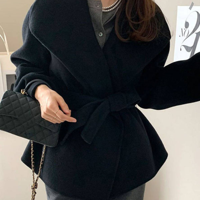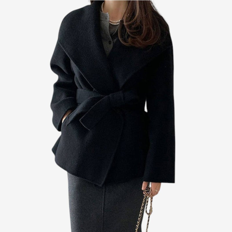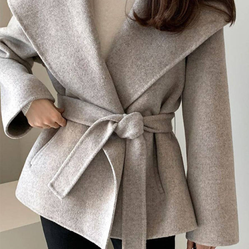 Malin – Mellomlang omslagskåpe med belte i livet og lange ermer