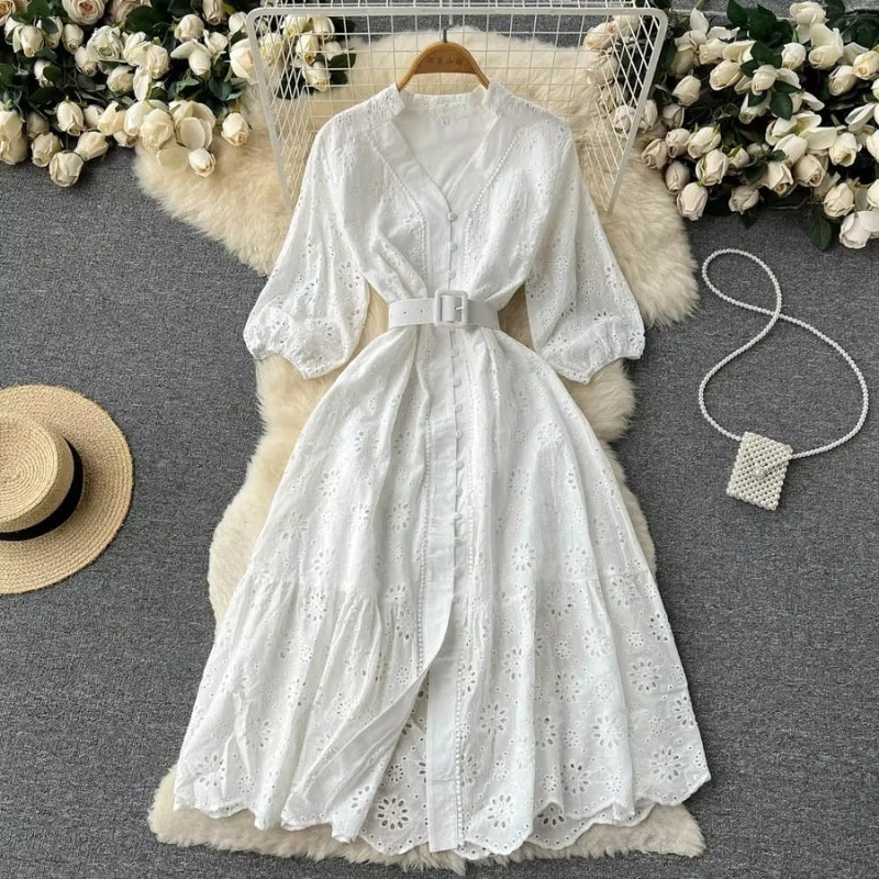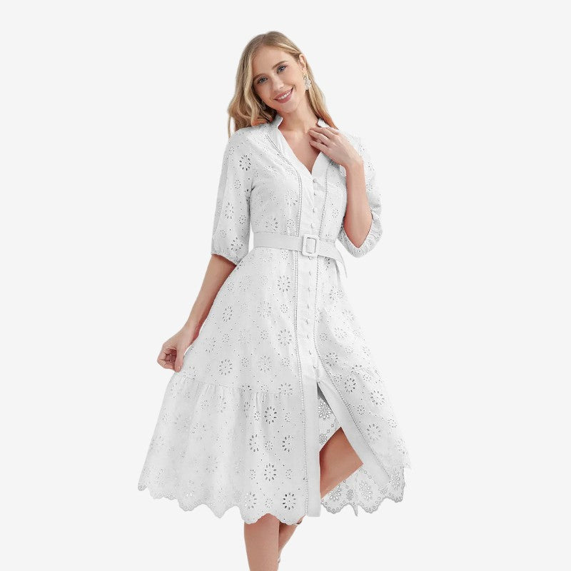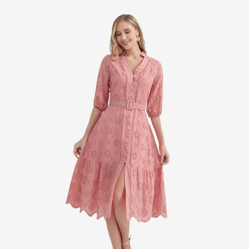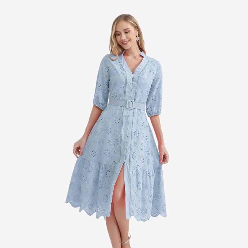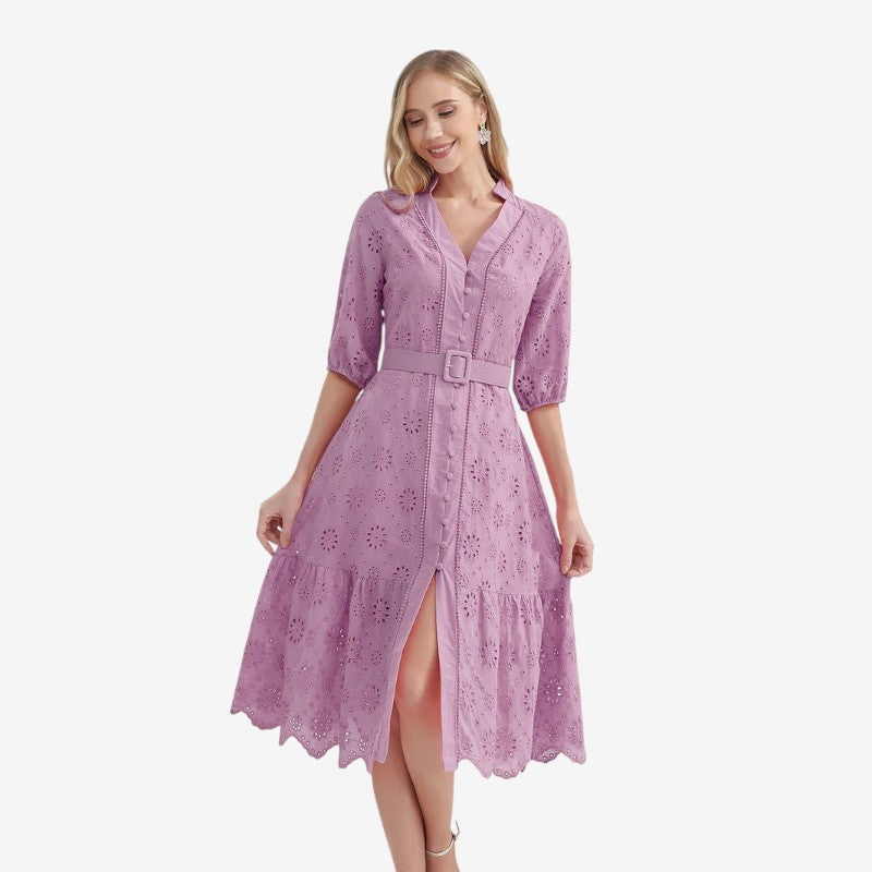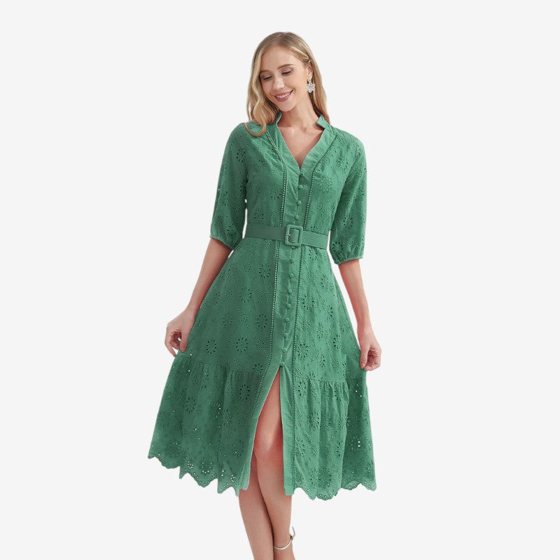 Nancy-kjolen har korte ermer, ståkrage med V-utringning og knappelukking foran. Et belte i midjen gir en justerbar passform, mens skjørtet med A-linje og rett hem skaper en ryddig og balansert silhuett. Minimal detaljering gjør kjolen egnet til både hverdags- og semi-formelle anledninger.