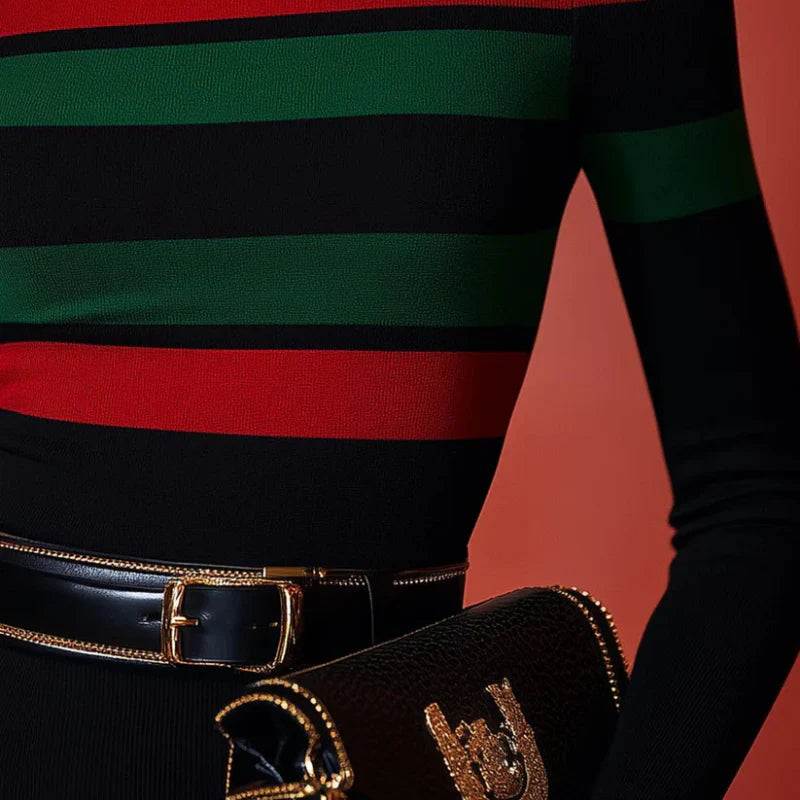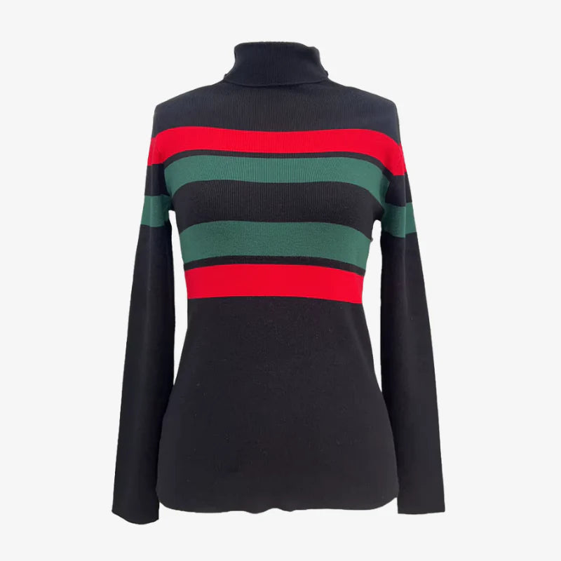 Den stripete Rosa-genseren med høy hals har en smal passform og lange ermer, noe som gjør den ideell å bruke lag på lag eller alene.