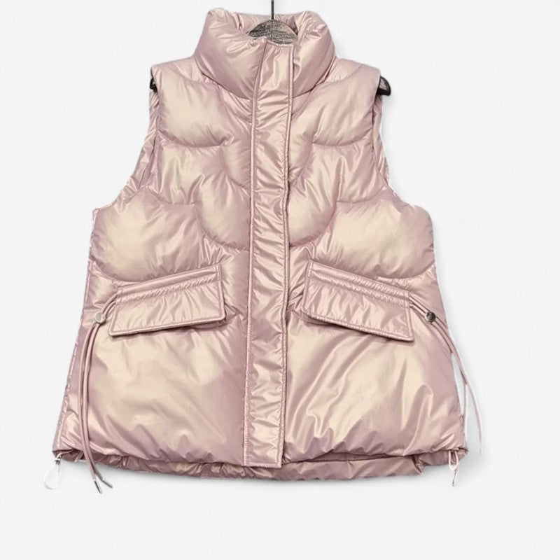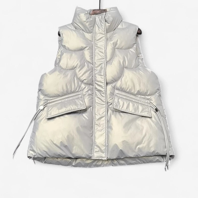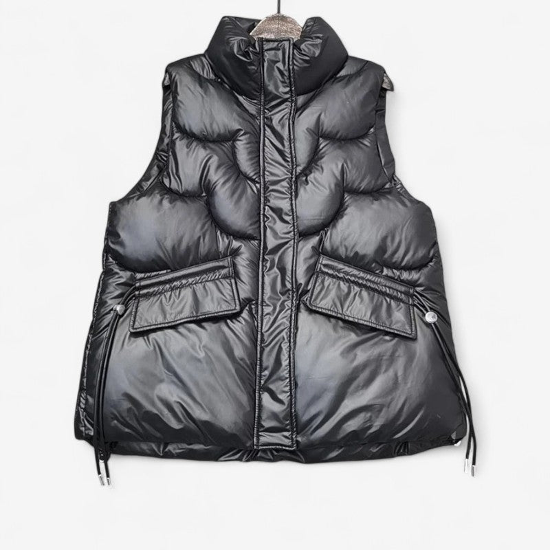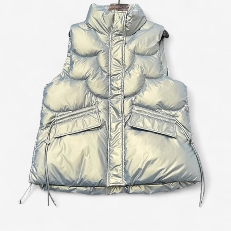 Selene-jakken har ståkrage, glidelås- og knappelukking foran, samt integrerte sidelommer. Den ermeløse utformingen fremhever en rett og balansert silhuett, mens minimal detaljer gir et rent og symmetrisk helhetsinntrykk.